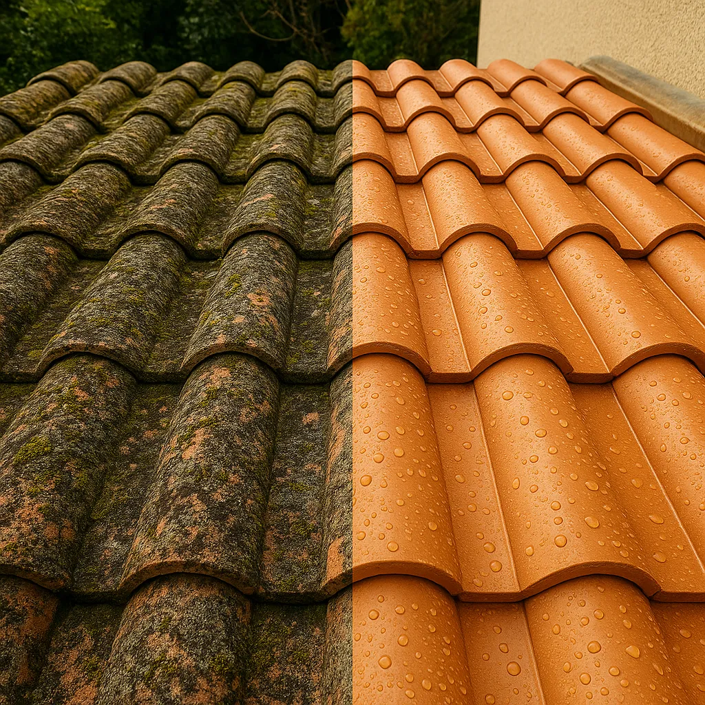 -Vos toitures en tuiles provençales, ardoises, béton ou fibrociment sont nettoyées, démoussées et protégées avec un traitement hydrofuge (option), pour une couverture saine et durable.